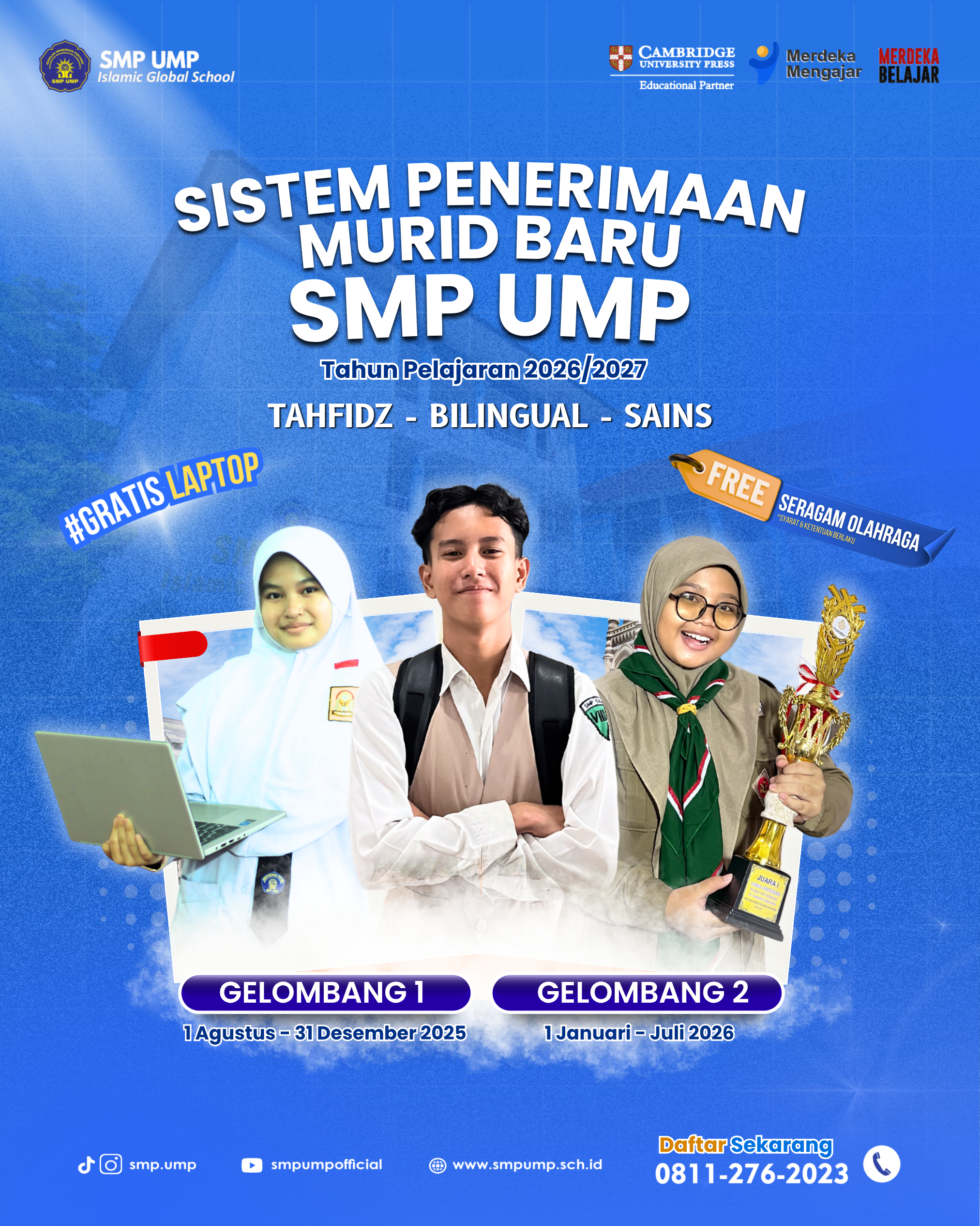 📣 PPDB SMP UMP Tahun Ajaran 2026/2027 Telah Dibuka! 📣Assalamu’alaikum.wr.wb, Ayah Bunda yang berbahagia! Kami dengan senang hati mengumumkan bahwa PPDB SMP UMP Tahun Ajaran 2026/2027 telah resmi dibuka! 📝 Mari bergabung bersama SMP UMP dengan menawarkan pendidikan yang berkualitas …